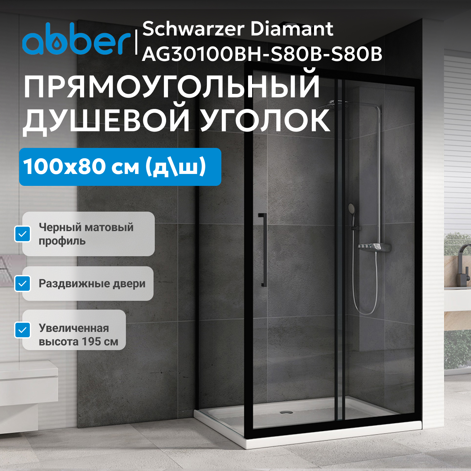 Душевой уголок ABBER Schwarzer Diamant AG30100BH-S80B-S80B сочетает современный дизайн и практичность для ванных комнат. Высота 195 см, прямоугольная форма, ширина 80 см и длина 100 см обеспечивают комфортное пространство для ежедневных процедур и позволяют рационально использовать площадь помещения.