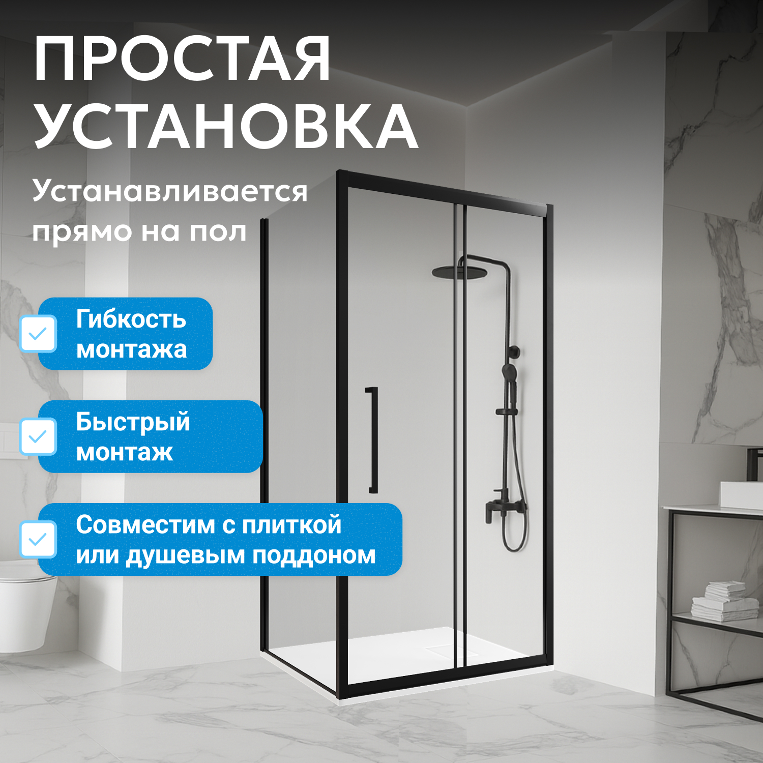 Модель предназначена для монтажа с низким поддоном (приобретается отдельно), что позволяет выбрать подходящую высоту и дизайн поддона под интерьер. Высота кабины — 195 см, длина и ширина — 100 см, что удобно для использования даже людьми высокого роста и обеспечивает организованное пространство.
