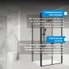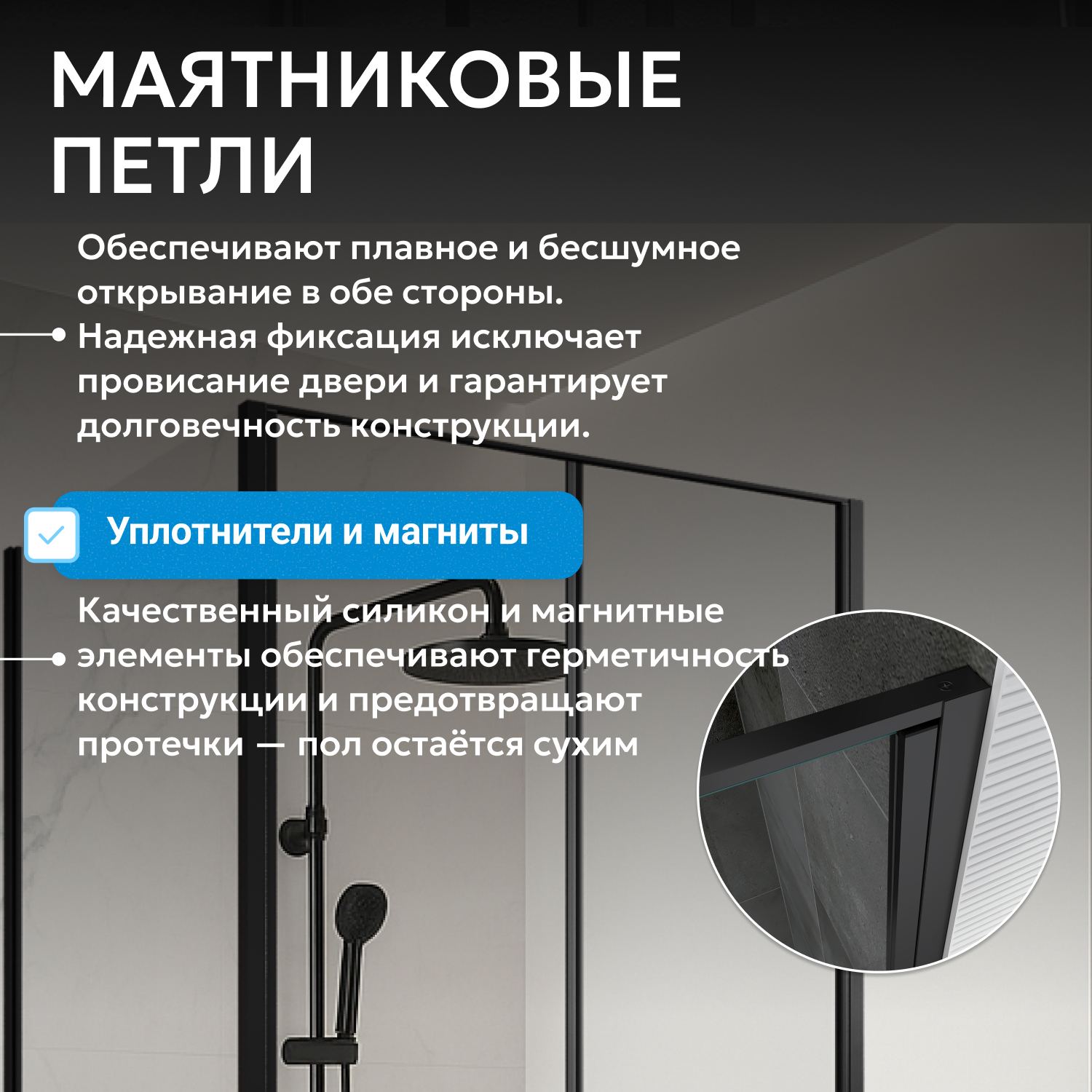 Устанавливается в угол помещения с использованием низкого поддона (не входит в комплект). Прозрачные стеклянные полотна толщиной 6 мм сочетаются с черным профилем и металлическими ручками. Квадратная форма и универсальная модификация подходят для разных интерьеров ванных комнат. Две распашные двери с шириной входа 881 мм обеспечивают удобный доступ.