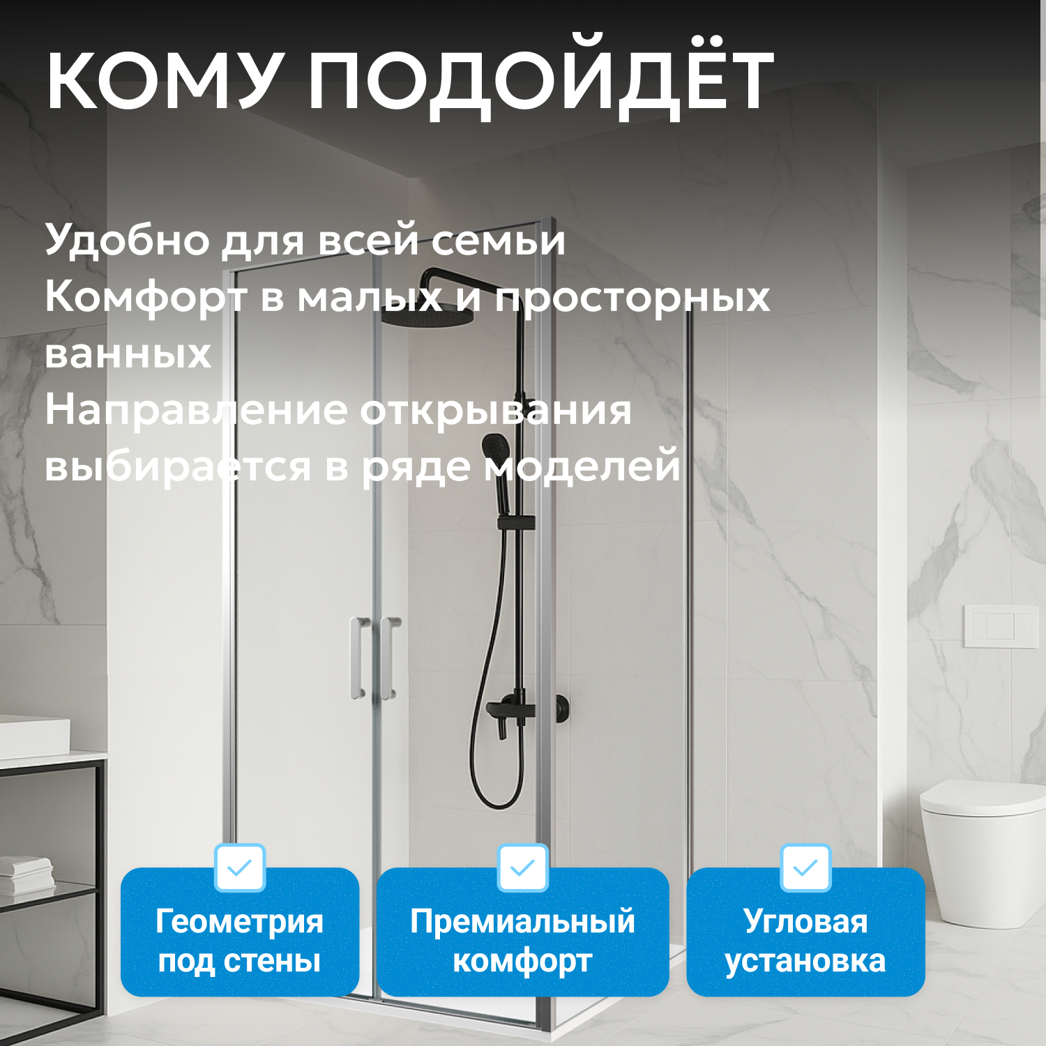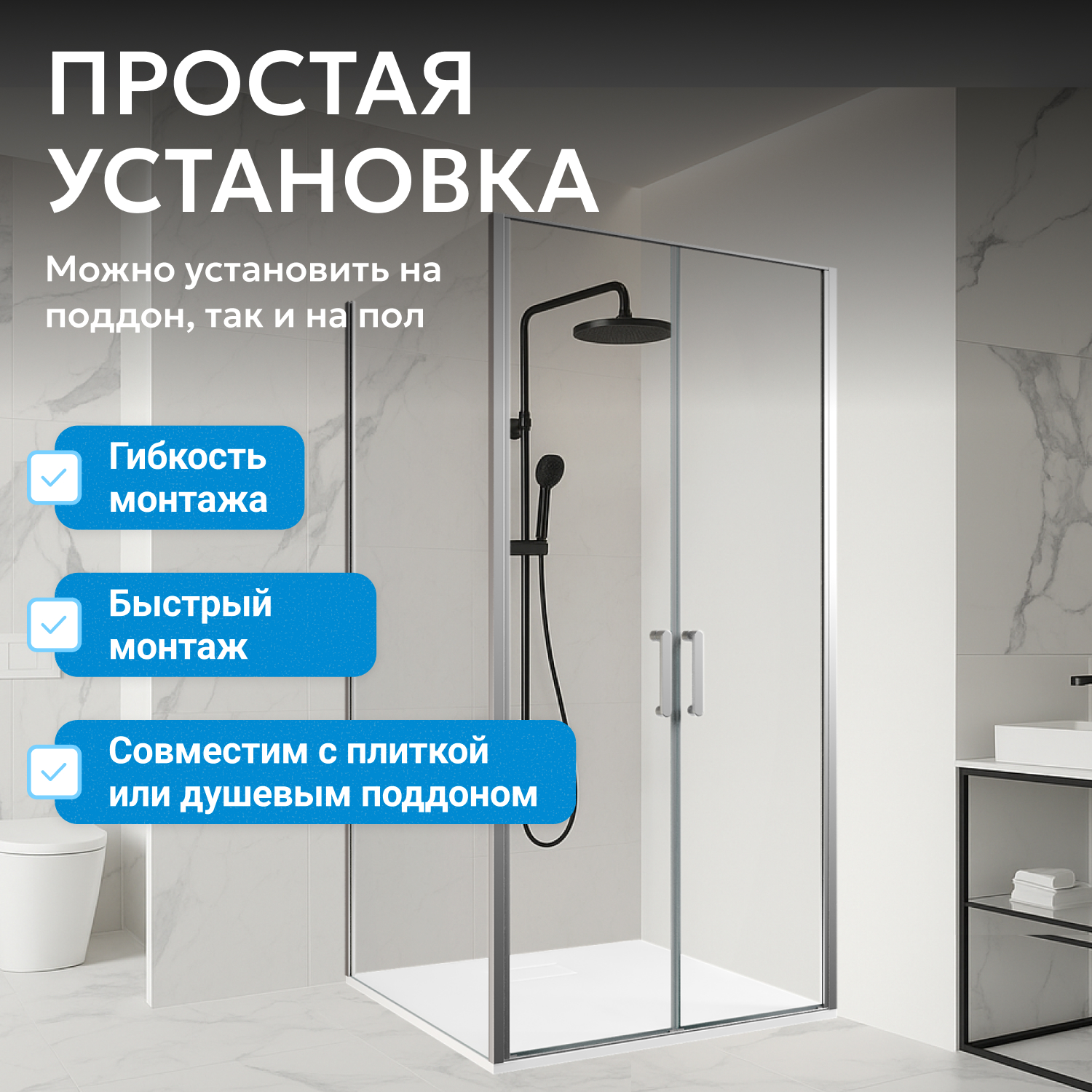 Поддон не входит в комплект, что позволяет подобрать подходящий вариант отдельно. Легкое обслуживание стеклянных поверхностей способствует долговечности и сохранению внешнего вида.