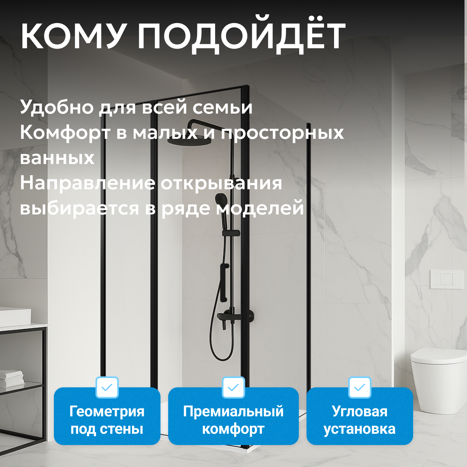 Для монтажа предусмотрен низкий поддон, приобретаемый отдельно, чтобы регулировать высоту конструкции. Широкий вход 654 мм обеспечивает комфортный проход. Отсутствие доводчиков и специальных покрытий упрощает уход за стеклом. Высота — 195 см, ширина — 90 см, длина — 120 см.