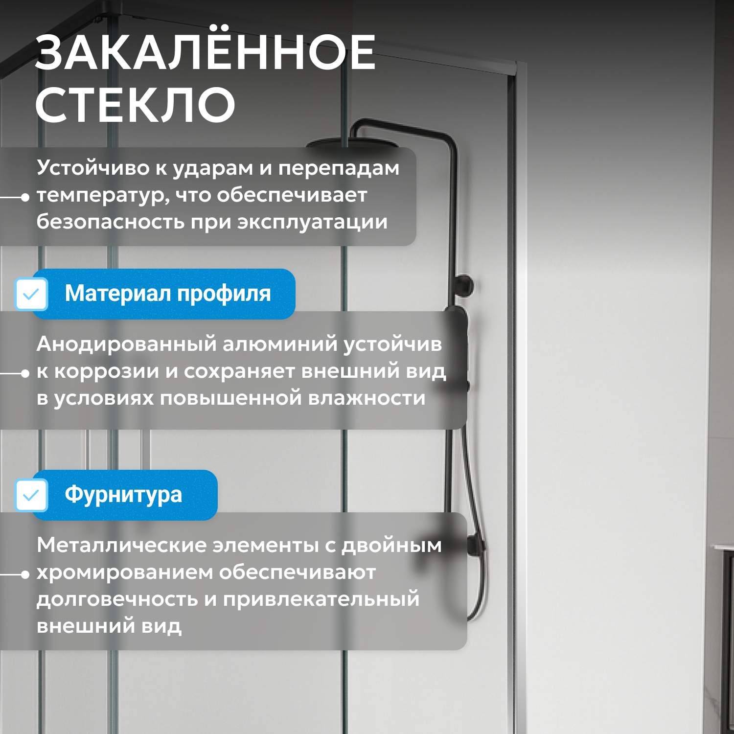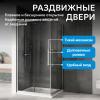 Модель оснащена двумя раздвижными дверями на двойных роликах для плавного и тихого открывания. Вход шириной 585 мм обеспечивает комфорт. Эргономичные металлические ручки устойчивы к влаге. Отсутствие поддона позволяет подобрать вариант с учётом особенностей помещения.