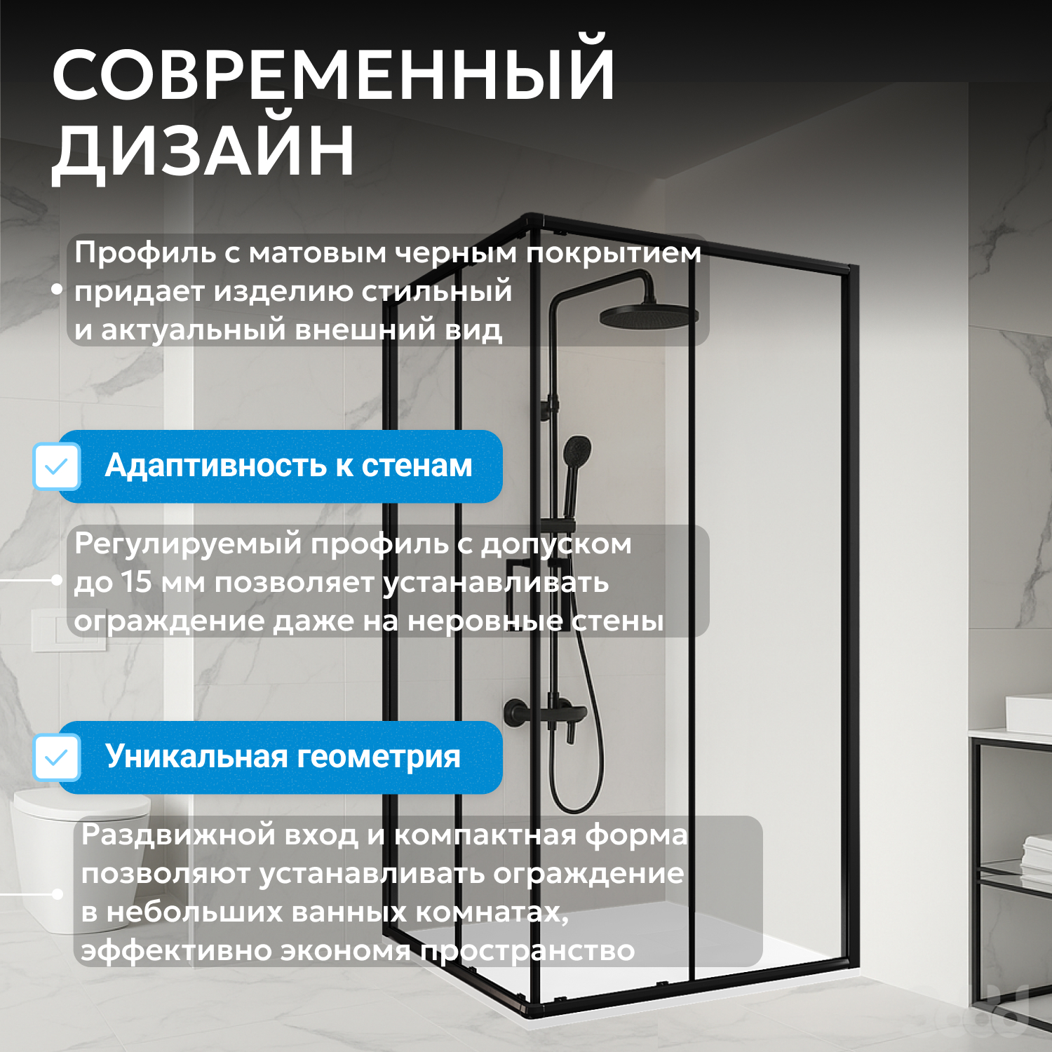 Чёрный профиль подходит для современных интерьеров, а универсальная модификация облегчает подбор дополнительной сантехники и низкого поддона подходящего размера. Высота конструкции 190 см оптимальна для большинства помещений, модель поставляется без поддона для индивидуального выбора. Прозрачное стекло визуально увеличивает пространство и подчёркивает строгие линии дизайна.