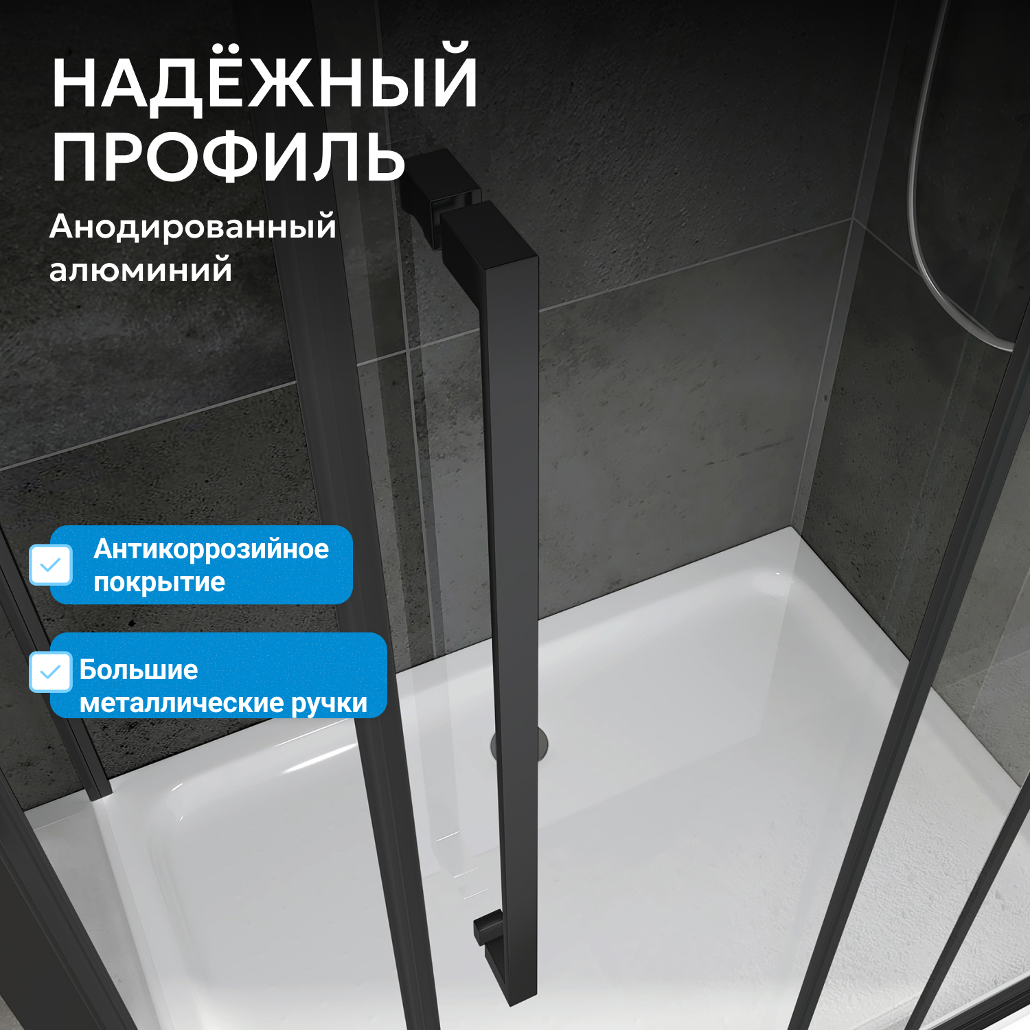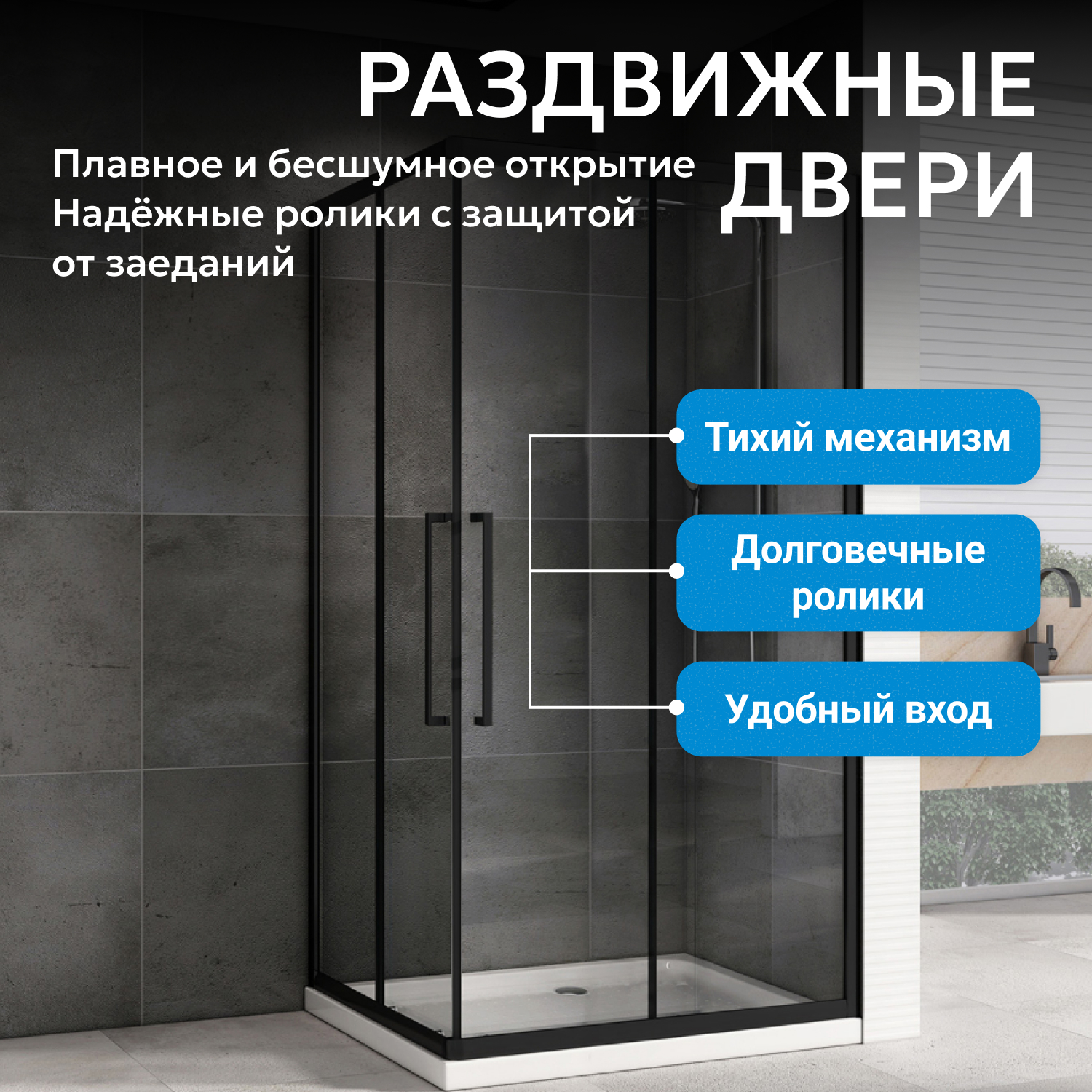 Раздвижные двери на двойных роликах обеспечивают плавное и надежное открывание, две двери оснащены металлическими ручками. Универсальная конструкция подходит для левостороннего и правостороннего монтажа. Для установки требуется низкий поддон, приобретаемый отдельно — это позволяет выбрать подходящий вариант по высоте и материалу.