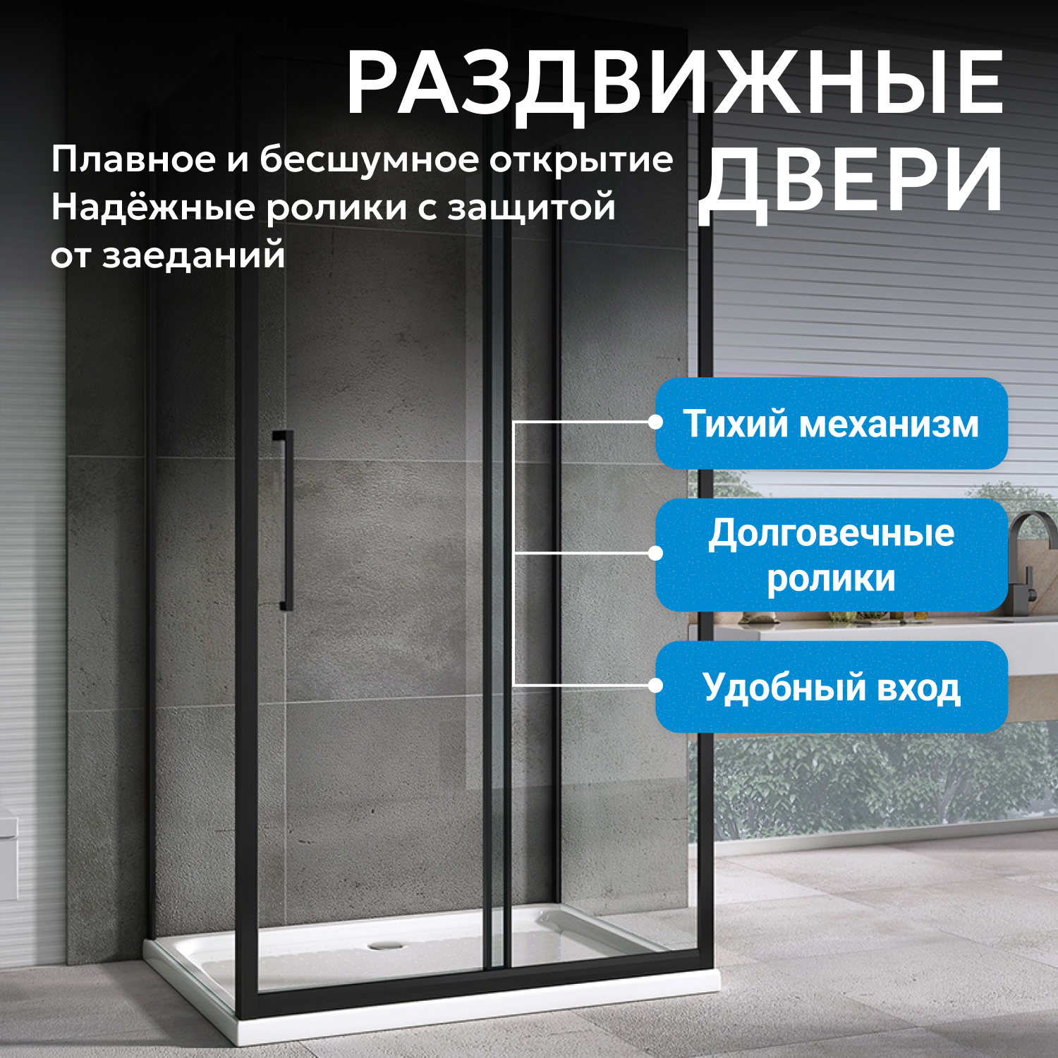 Дверь раздвижная, система двойных роликов и металлические ручки обеспечивают легкое и плавное скольжение. В комплекте только душевой уголок — поддон приобретается отдельно, что позволяет подобрать вариант под особенности помещения.