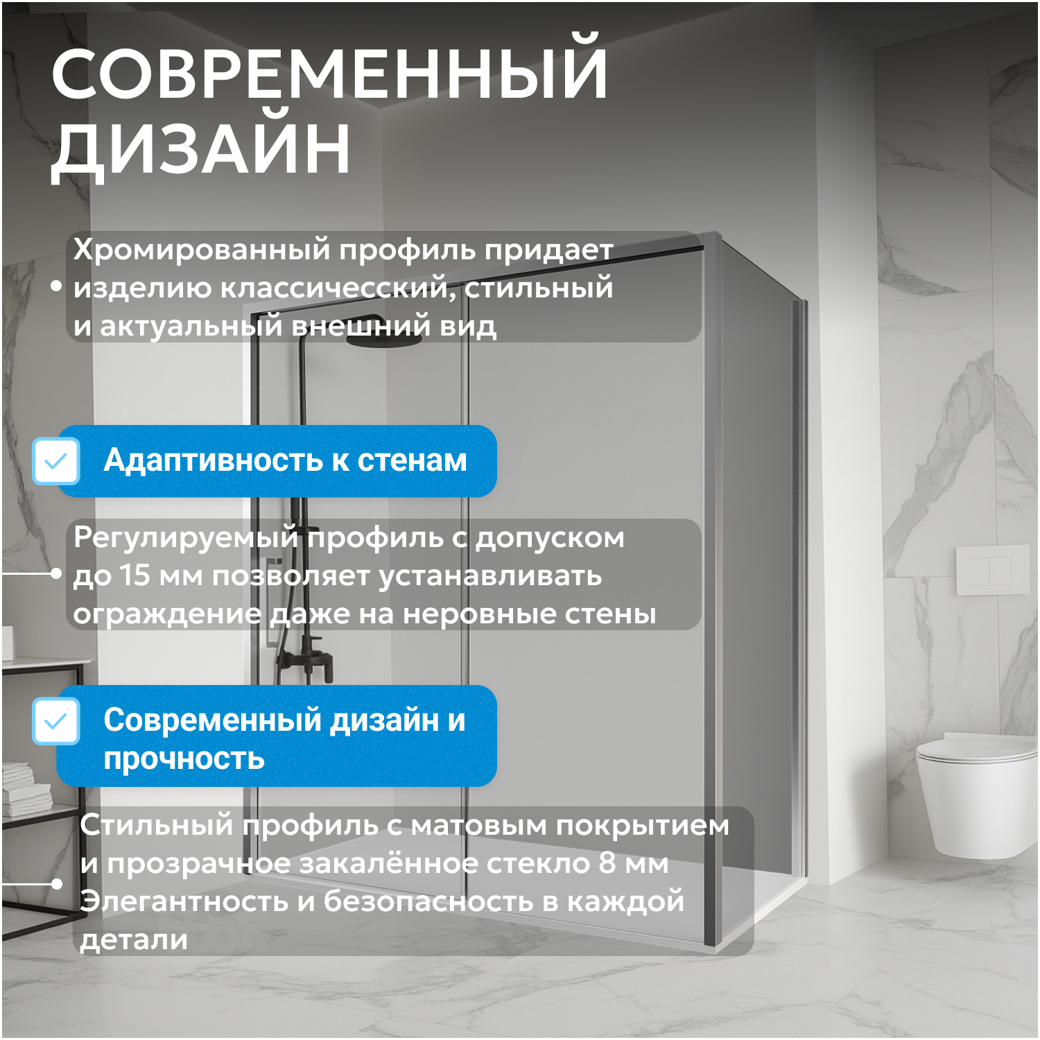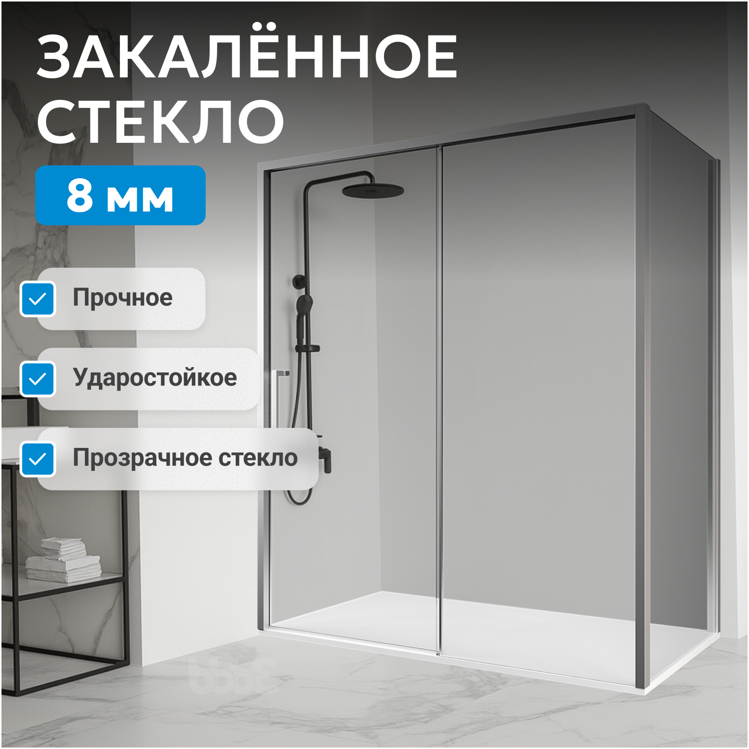 Стекло с водоотталкивающим покрытием облегчает уход и поддерживает чистоту. Установка в угол экономит место в ванной комнате. Soft-close доводчики в раздвижной двери обеспечивают плавное и бесшумное закрытие, уменьшают риск повреждений и продлевают срок службы конструкции.
