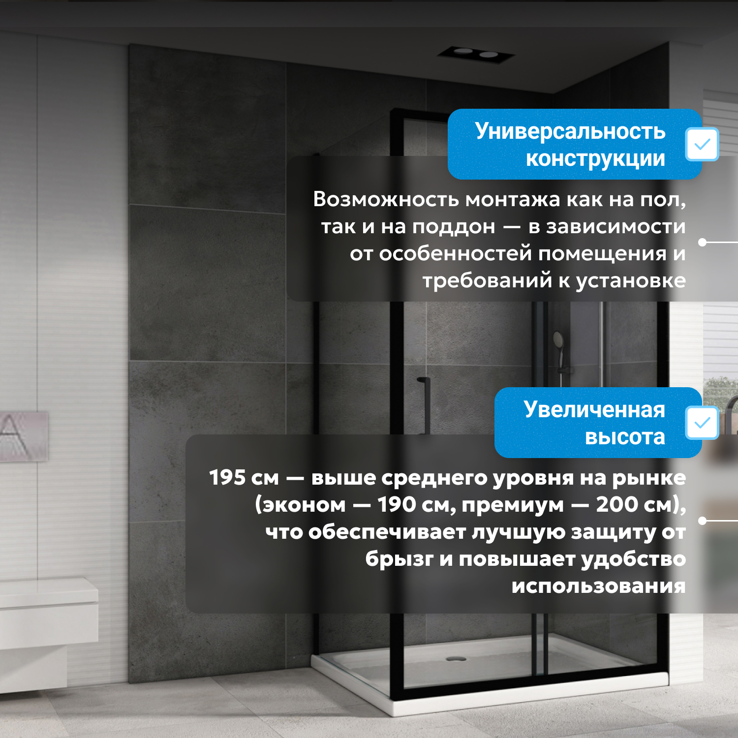 Модель оснащена одной раздвижной дверью на двойных роликах для плавного и надежного хода. Пластиковая ручка устойчива к коррозии и удобна при использовании. Универсальная модификация упрощает подбор при ремонте. Для установки требуется низкий поддон, приобретается отдельно — это позволяет выбрать подходящий вариант.