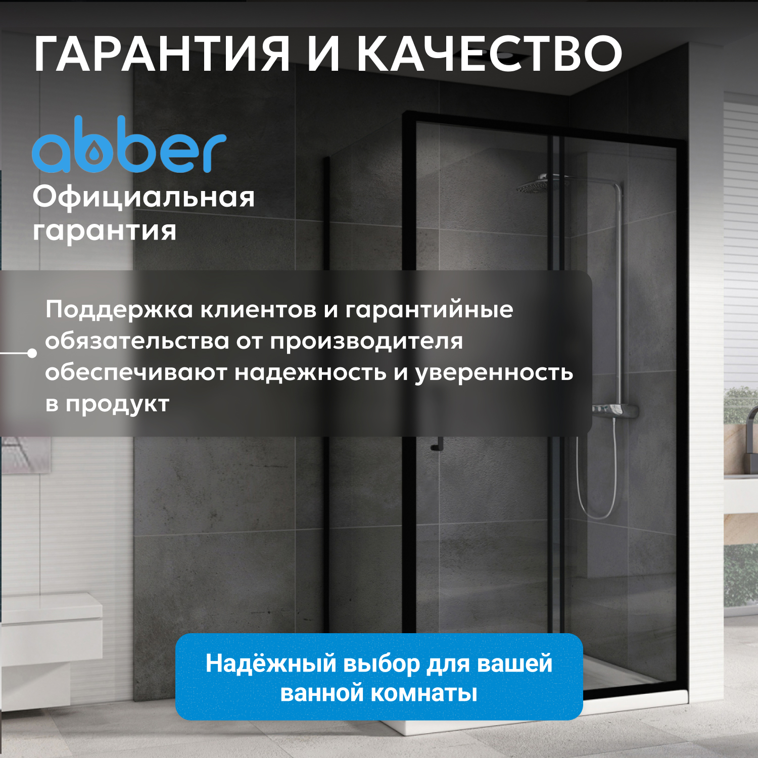 ABBER душ кабиналары алюминий профилінен, ұнтақпен боялған және шыңдалған, соққыға төзімді шыныдан жасалған. Шыны душ кабиналары да бірқатар артықшылықтарға ие: тазалау оңай, сенімді және ұзақ жұмыс істейді.