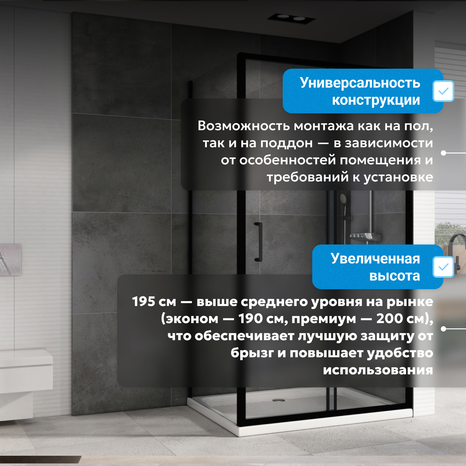 ABBER душ кабиналары алюминий профилінен, ұнтақпен боялған және шыңдалған, соққыға төзімді шыныдан жасалған. Шыны душ кабиналары да бірқатар артықшылықтарға ие: тазалау оңай, сенімді және ұзақ жұмыс істейді.