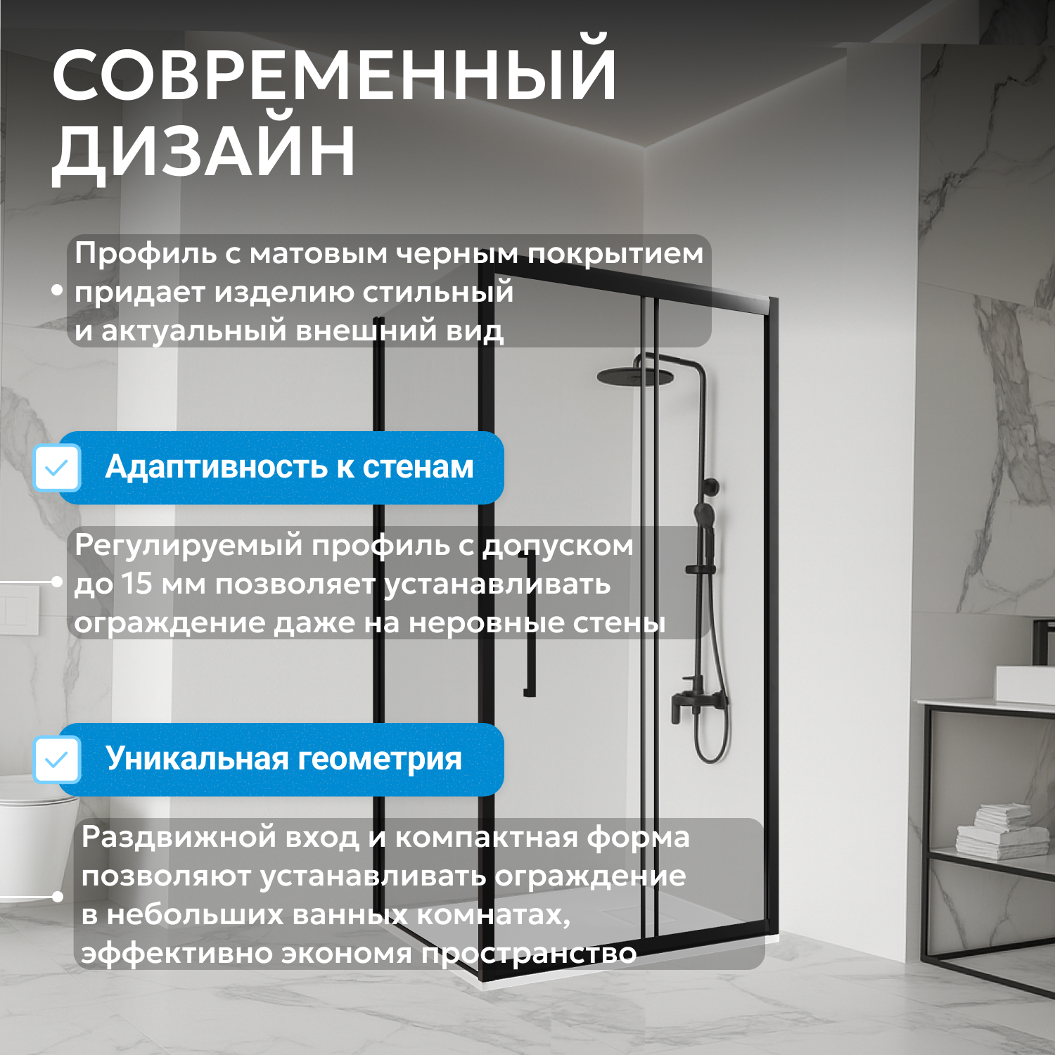Душевой уголок оснащён металлическими ручками для удобства эксплуатации. Прозрачное стекло визуально увеличивает пространство. В конструкции отсутствуют доводчики и водоотталкивающее покрытие — это упрощает обслуживание и чистку, а также снижает стоимость эксплуатации. Поддон приобретается отдельно, что позволяет выбрать модель по форме и высоте в соответствии с особенностями ванной комнаты.