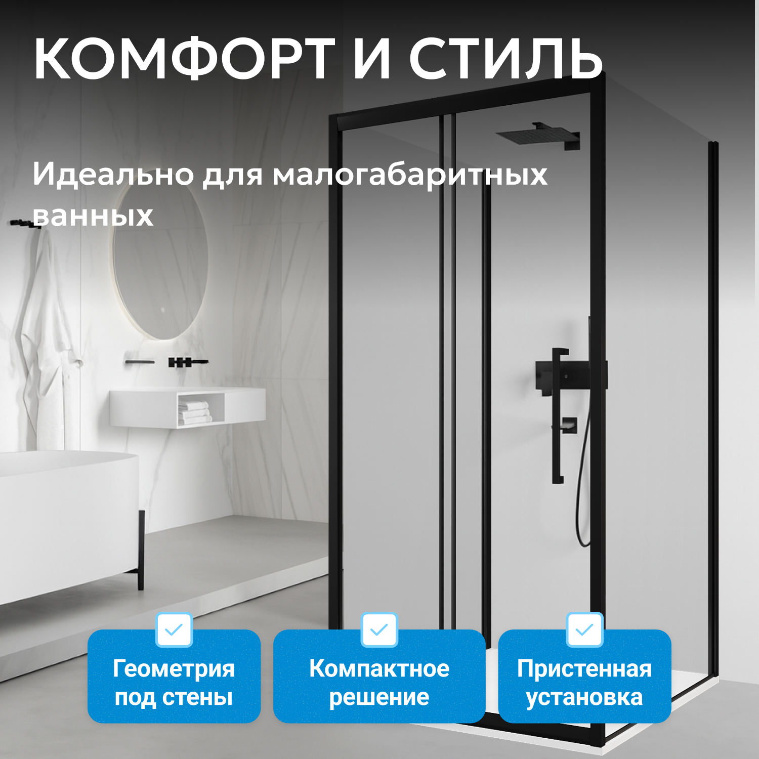 Высота уголка — 195 см, что создает дополнительный комфорт. Раздвижная система двери экономит место, делая изделие удобным даже для компактных помещений. Пристенный монтаж облегчает установку, а прямоугольная форма интегрируется в современный интерьер. Вход шириной 498 мм позволяет легко заходить внутрь.