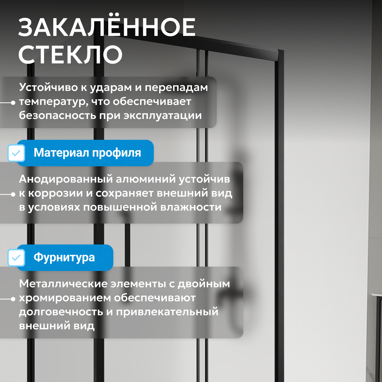 Модель оснащена матовым 6 мм стеклом, устойчивым к механическим воздействиям и не требующим особого ухода. Металлические ручки и крепления обеспечивают прочность и долговечность, а двойные ролики — плавное и надежное скольжение раздвижной двери. Ширина входа составляет 398 мм.