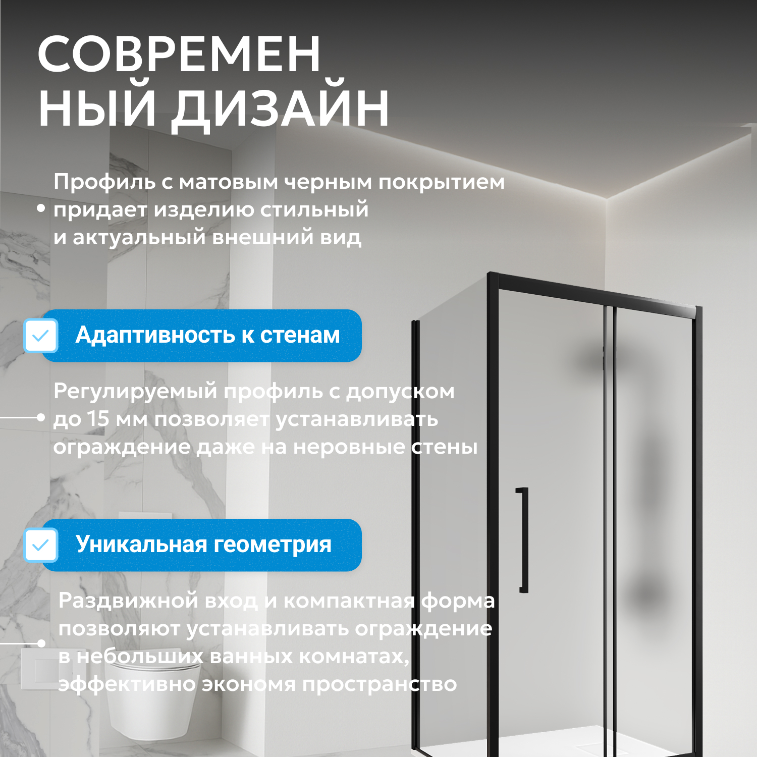 Уголок оснащён одной раздвижной дверью с системой двойных роликов для плавности хода и долговечности механизма. Установлены металлические ручки, устойчивые к коррозии и повреждениям. Высота 195 см обеспечивает комфорт и защиту от брызг.