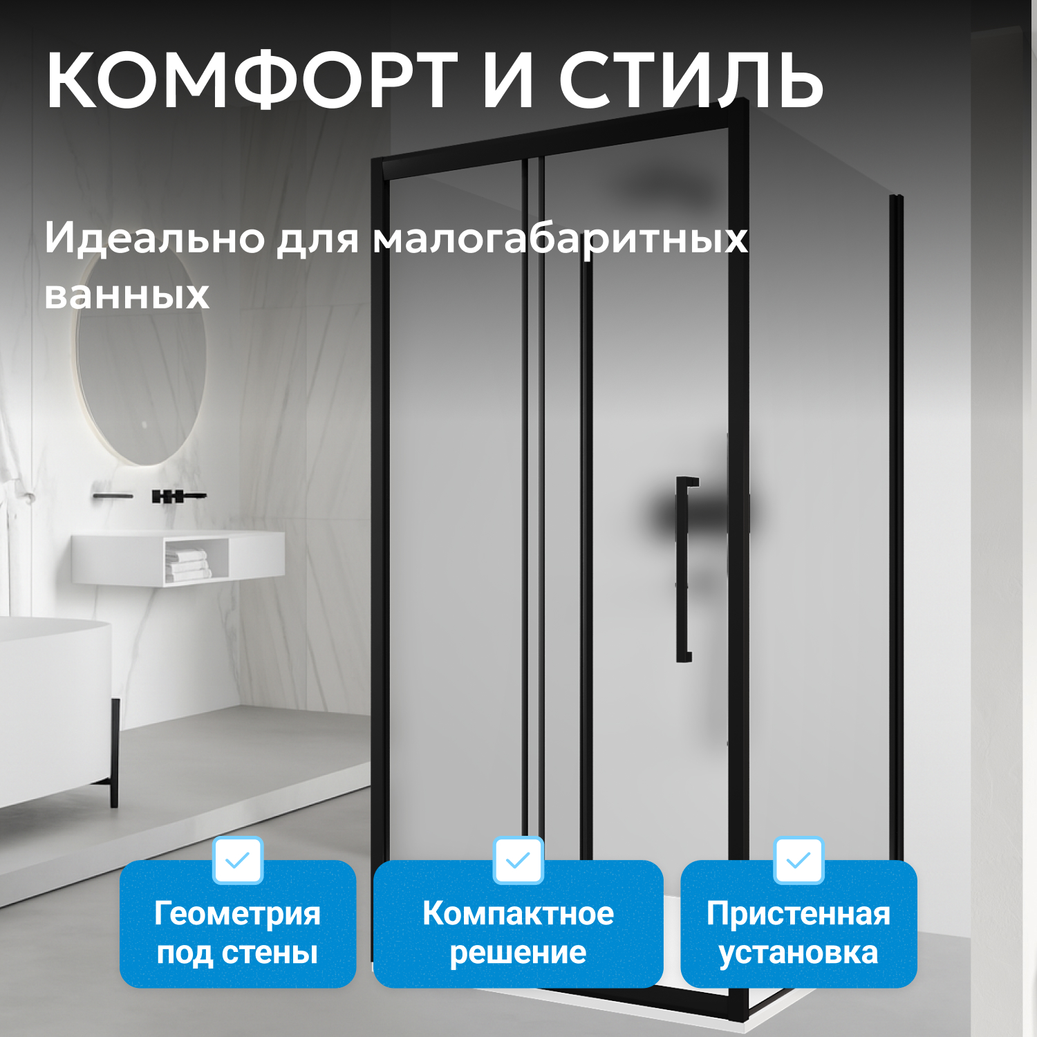 Модель поставляется без поддона — можно выбрать низкий поддон или организовать слив в полу. Высота уголка — 195 см, ширина — 100 см, длина — 120 см, подходит для ванных комнат средних и больших размеров.