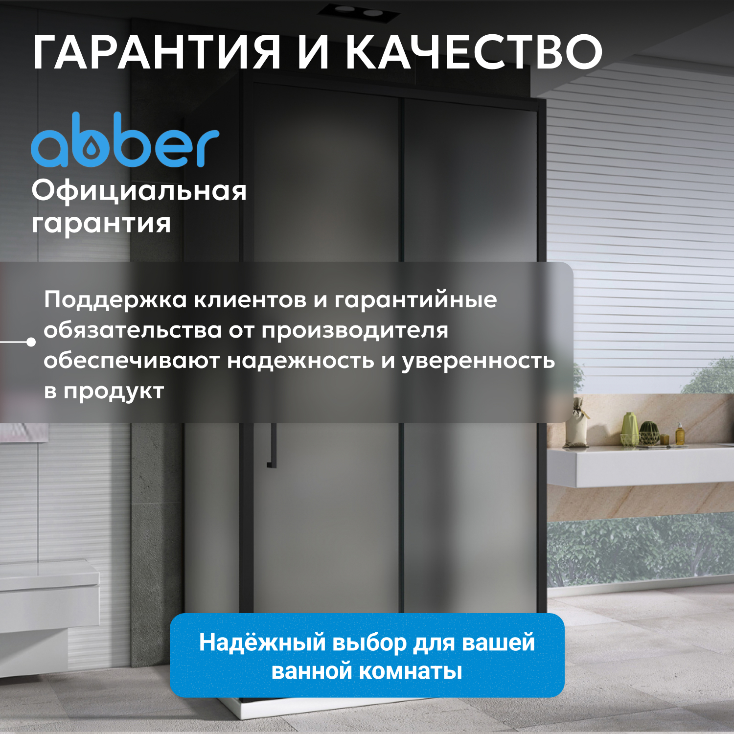 ABBER сочетает немецкое качество с современным дизайном. Официальная гарантия — 3 года. Продукция сертифицирована и рассчитана на продолжительный срок службы. Прочное стекло и металлическая фурнитура обеспечивают устойчивость к повреждениям. Низкий поддон позволяет реализовать разные варианты установки. Сервисная поддержка доступна по всей России, сервисные центры расположены в Москве и Санкт-Петербурге.