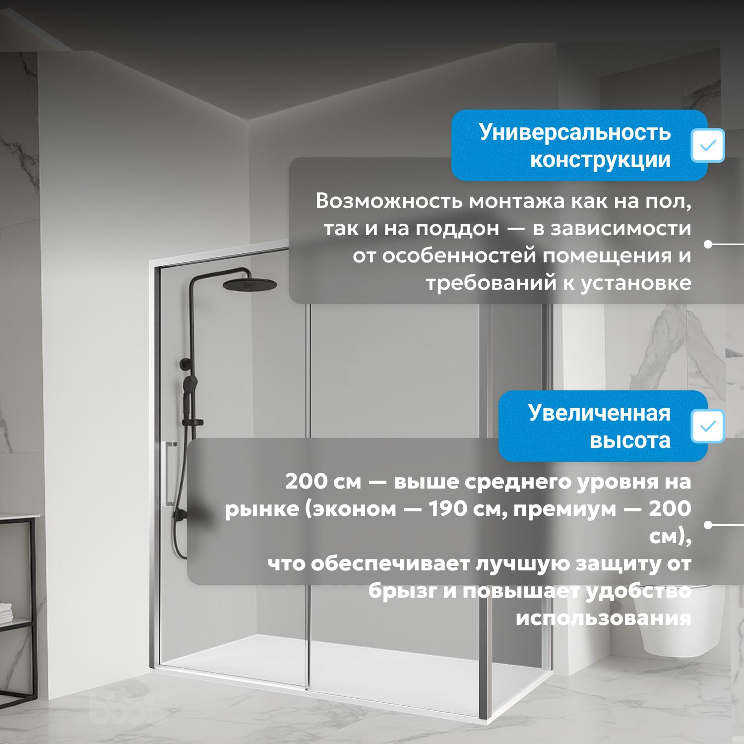 Модель рассчитана на монтаж с низким поддоном (не входит в комплект), что даёт больше свободы при подборе комплектации. Производитель предоставляет гарантию 3 года. Сервисная поддержка доступна по всей России, сервисные центры — в Москве и Санкт-Петербурге.