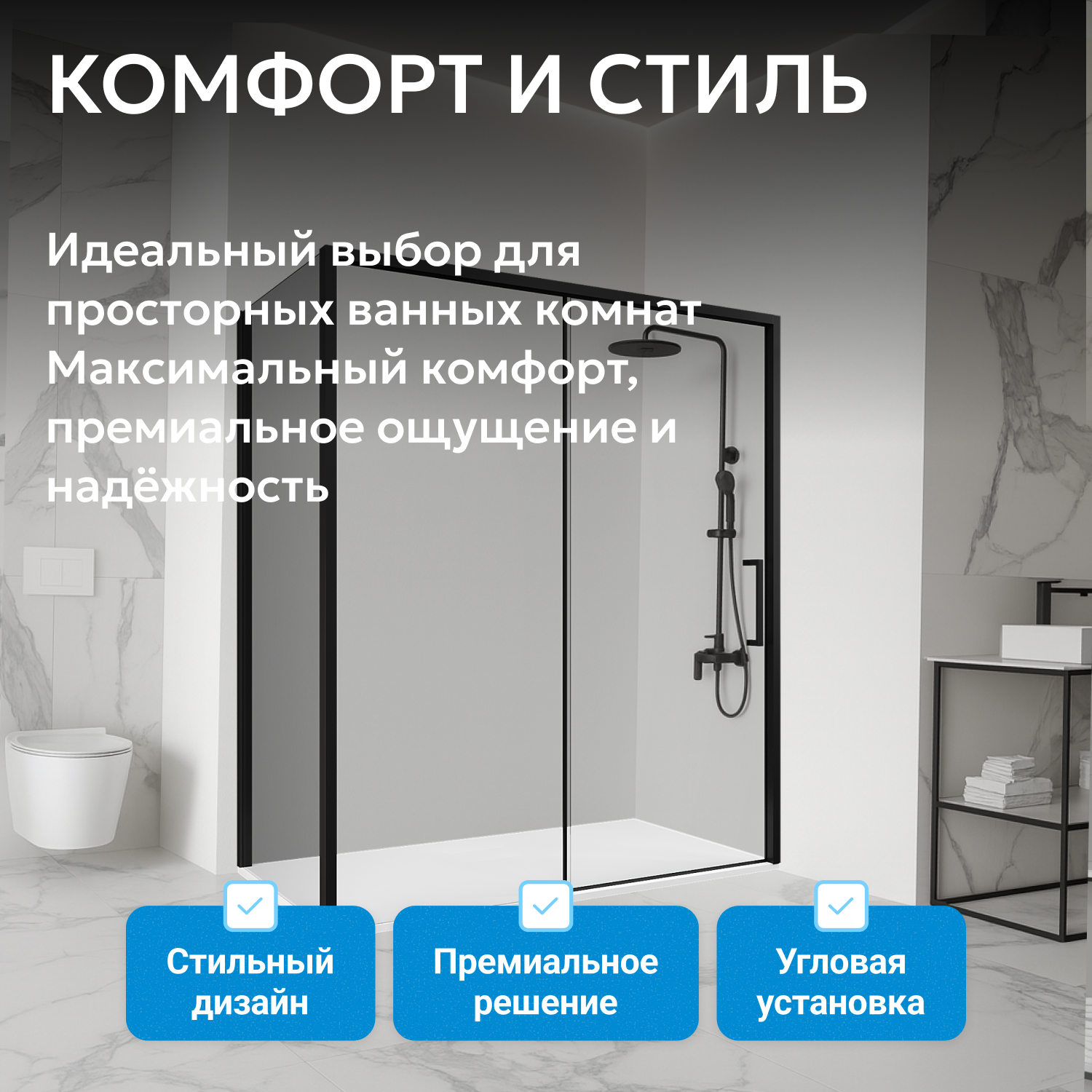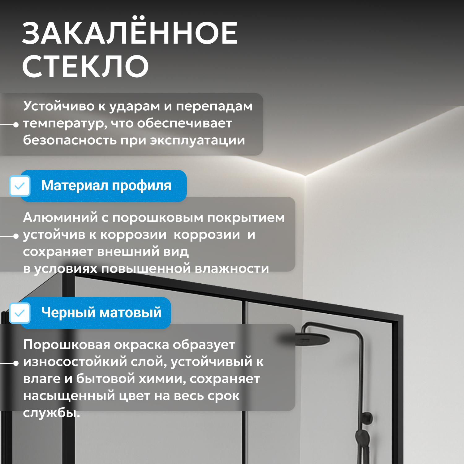 Модель оснащена одной раздвижной дверью с системой Soft-close. Доводчики обеспечивают мягкое и бесшумное закрытие, фиксация двери упрощает использование. Водоотталкивающее покрытие защищает стекло от разводов и известкового налёта, облегчая уход.