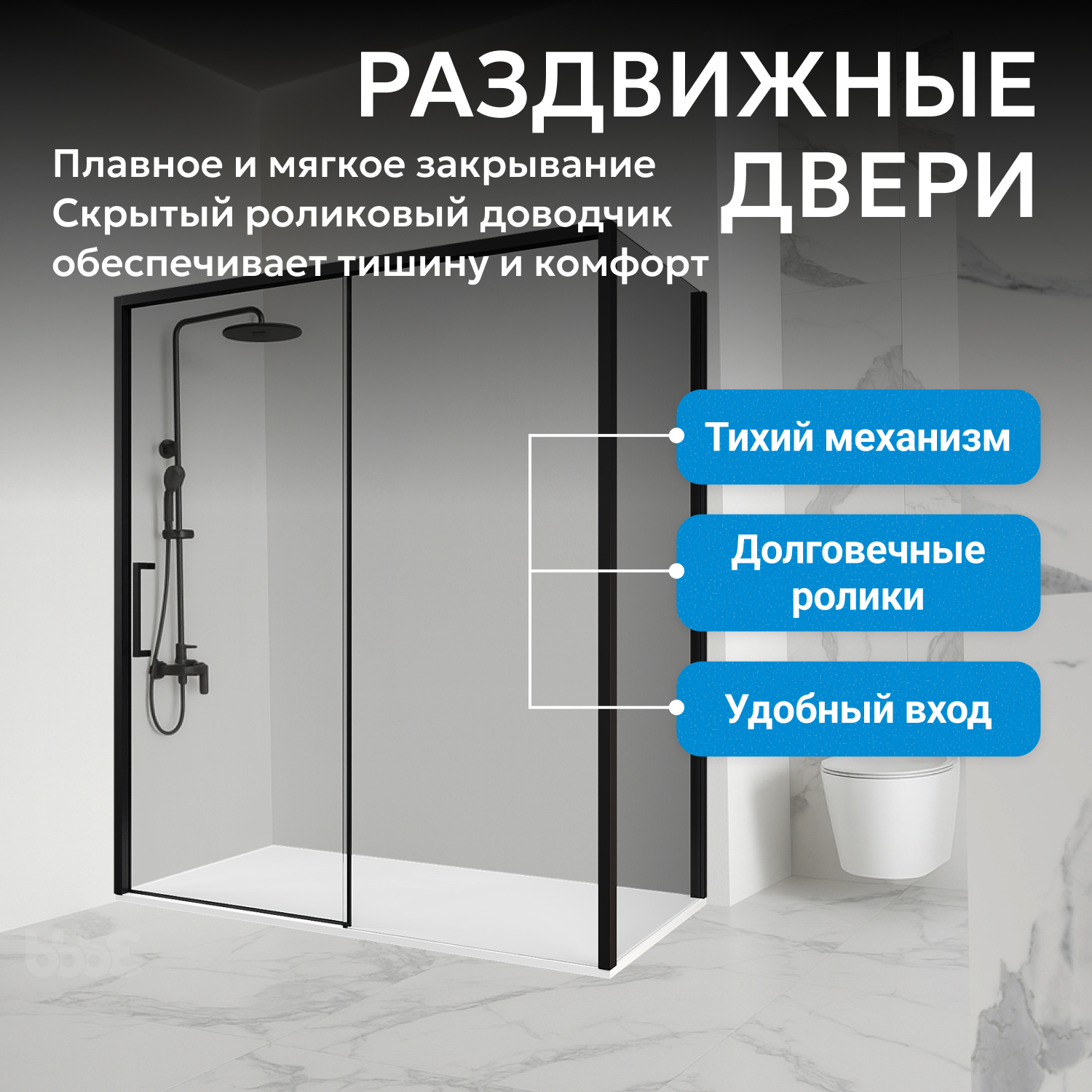 Модель имеет прямоугольную форму, оснащена прозрачным закаленным стеклом толщиной 8 мм. Пристенный профиль шириной 60 мм и усиленная раздвижная конструкция двери способствуют долговечности и устойчивости. Черный цвет профиля гармонично сочетается с современной сантехникой.