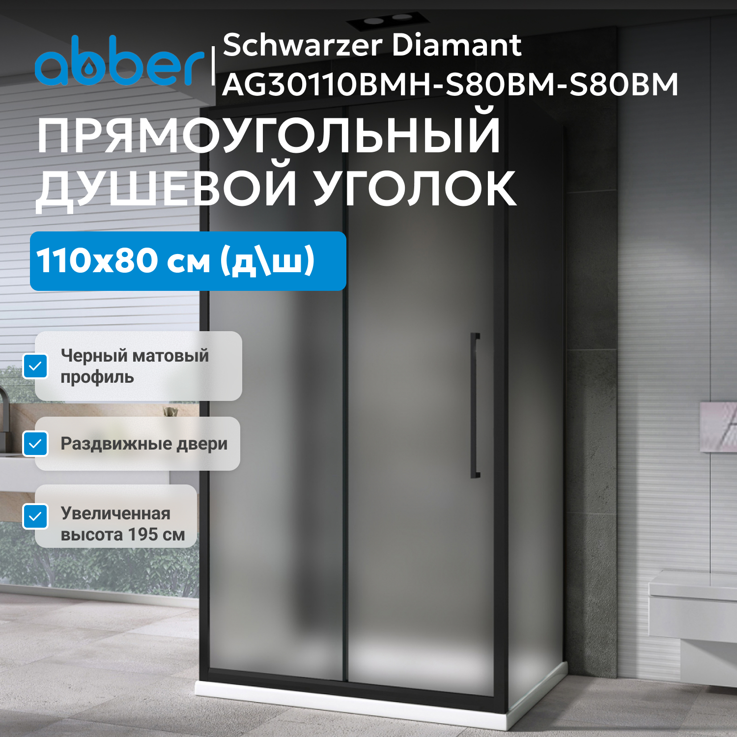 Конструкция из матового стекла толщиной 6 мм сочетает устойчивость к механическим воздействиям с современным внешним видом. Черный профиль легко вписывается в актуальные цветовые решения санузлов. Высота уголка — до 195 см, что удобно для пользователей разного роста.