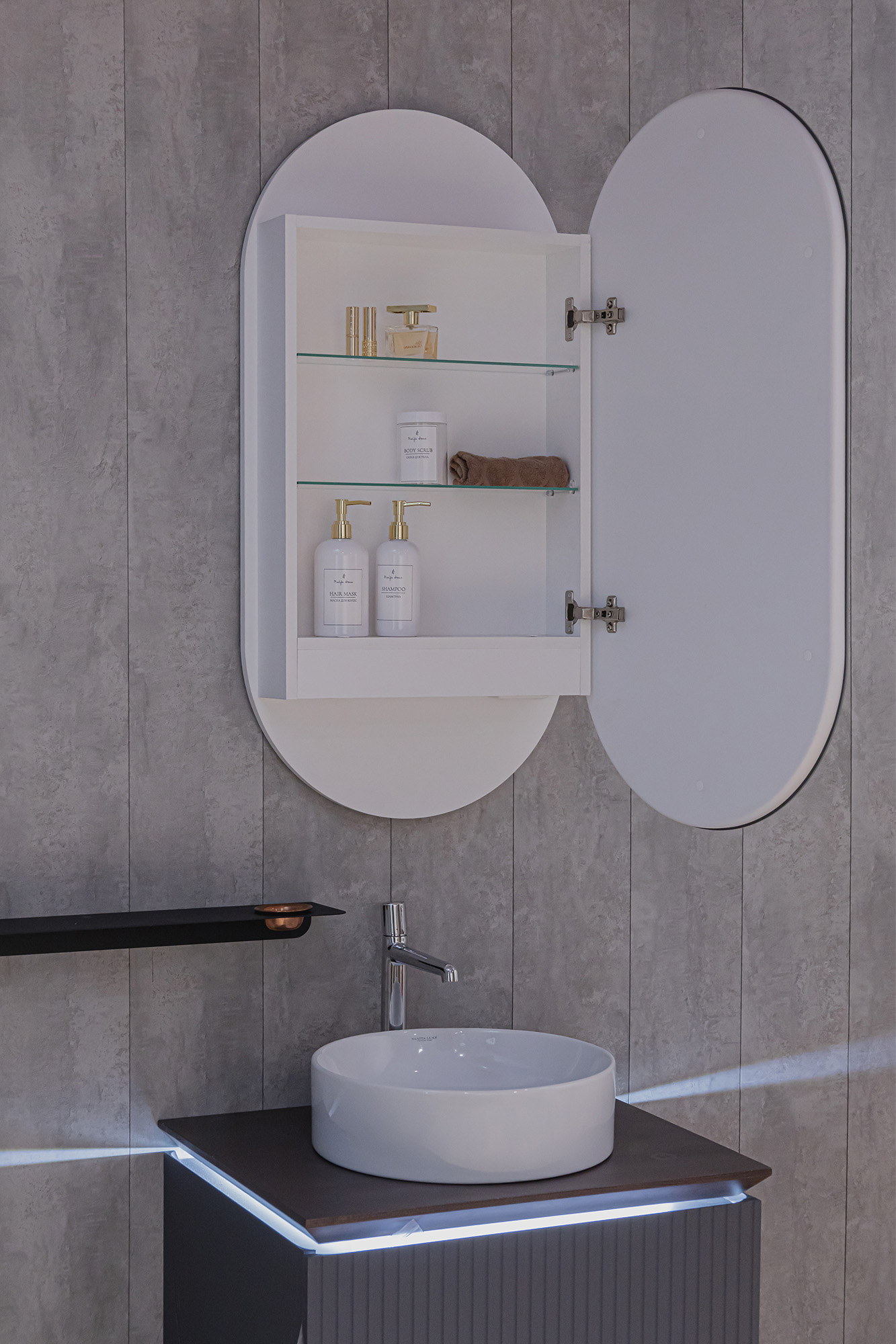 Изделие оснащено LED подсветкой с сенсорным выключателем и функцией плавного диммирования, с запоминанием последнего значения. Короткие касания сенсора включают/выключают подсветку, длительное касание меняет яркость свечения. Шкафчик оснащен стеклянными полочками для хранения, розеткой, доводчиком для плавного закрывания дверцы.
