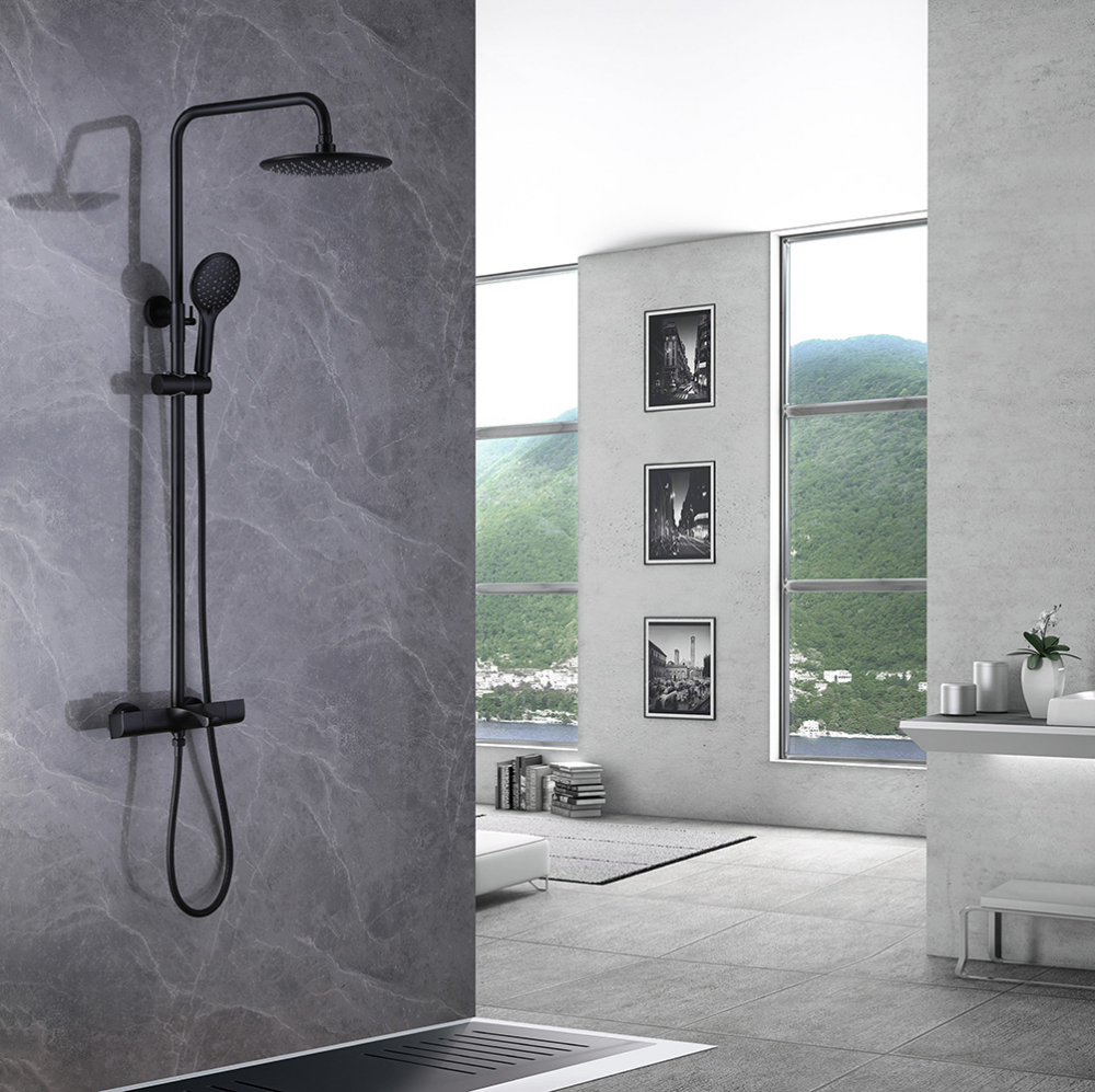 Душевая стойка ABBER Thermostat AF8516BL с термостатом и изливом, черный матовый