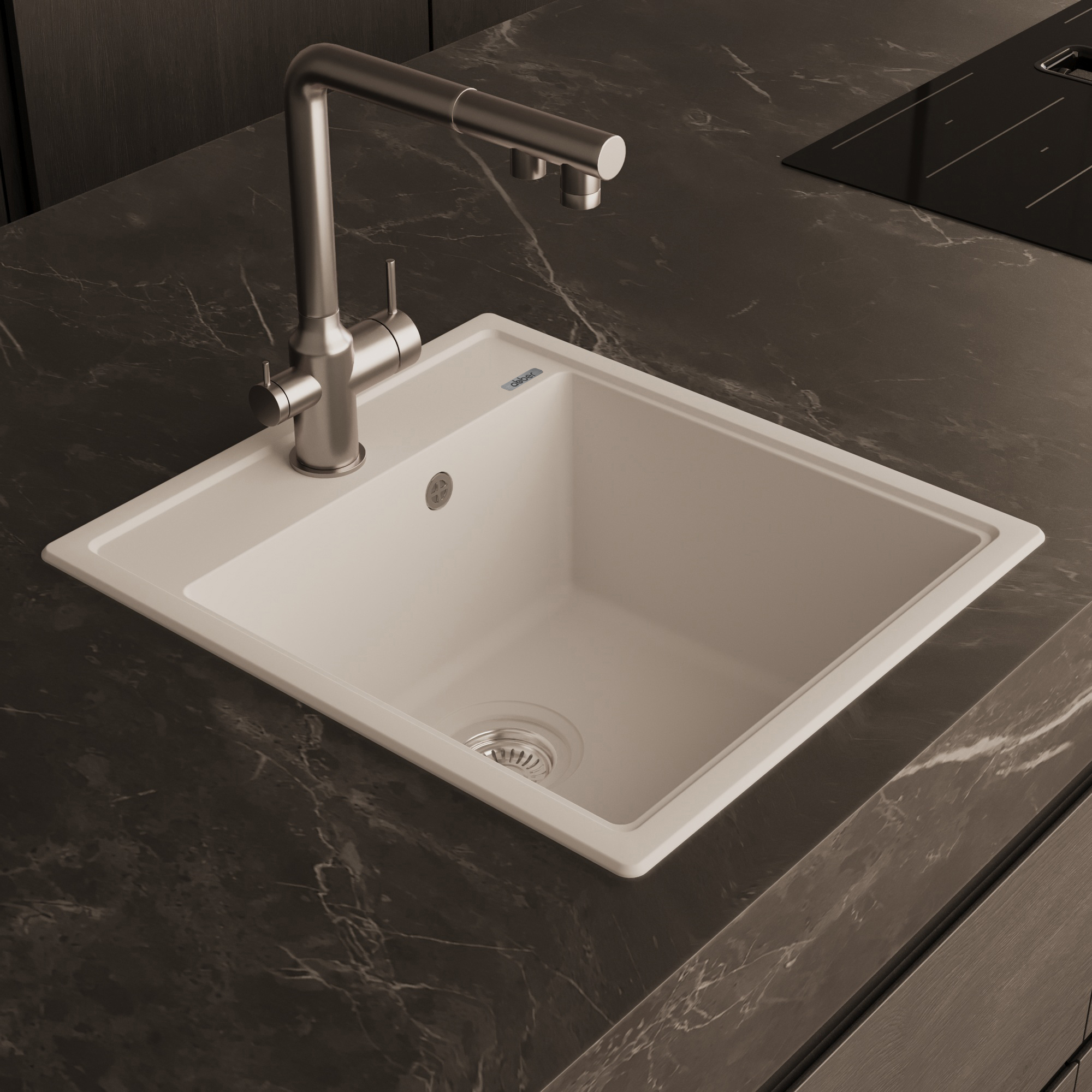 Кухонные мойки ABBER из кварцевого композита — это долговечность, надежность и простота в уходе. Белая кварцевая мойка 46х51х21,7см — неизменная и неустаревающая классика. Вы можете выбрать мойку с крылом или без. Чтобы очистить мойку, не нужно использовать какие-то специализированные средства. Кварцевая мойка не боится повреждений, не окрашиваются продуктами. Как натуральный камень, но лучше и дешевле!