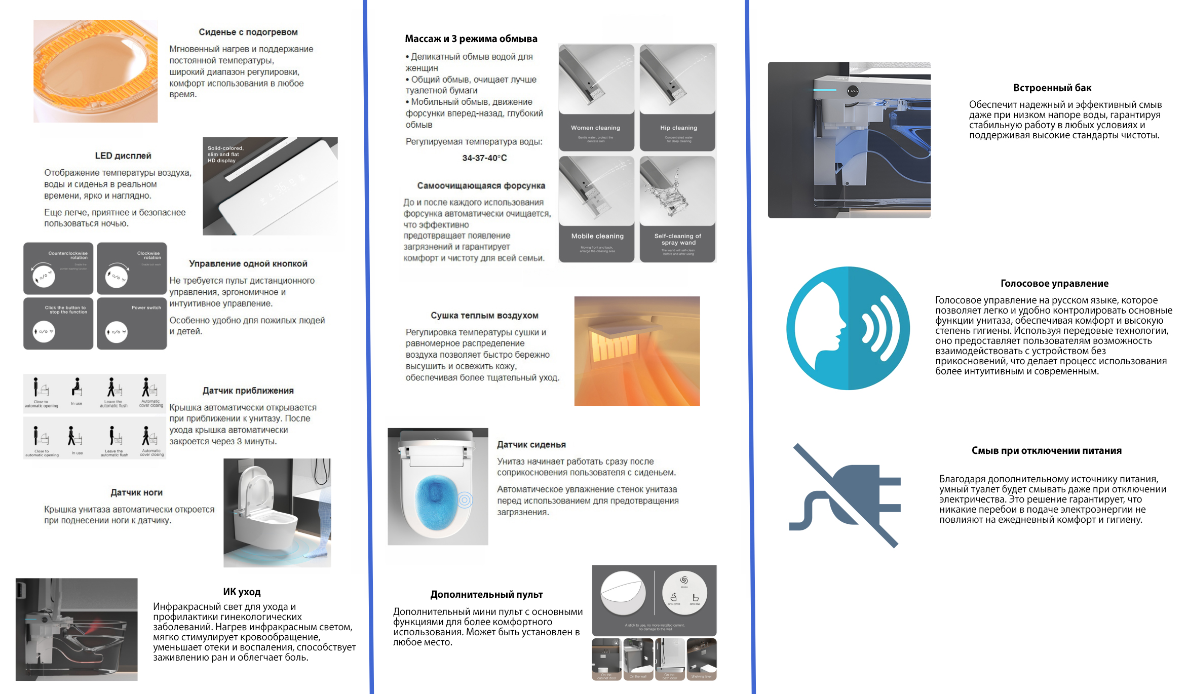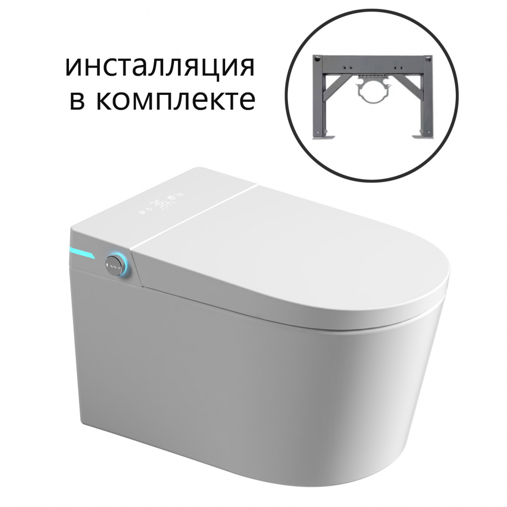 Состоит из подвесного керамического электронного унитаза-биде с импульсным смывом, сиденья для унитаза из дюропласта с микролифтом, инсталляции для унитаза.