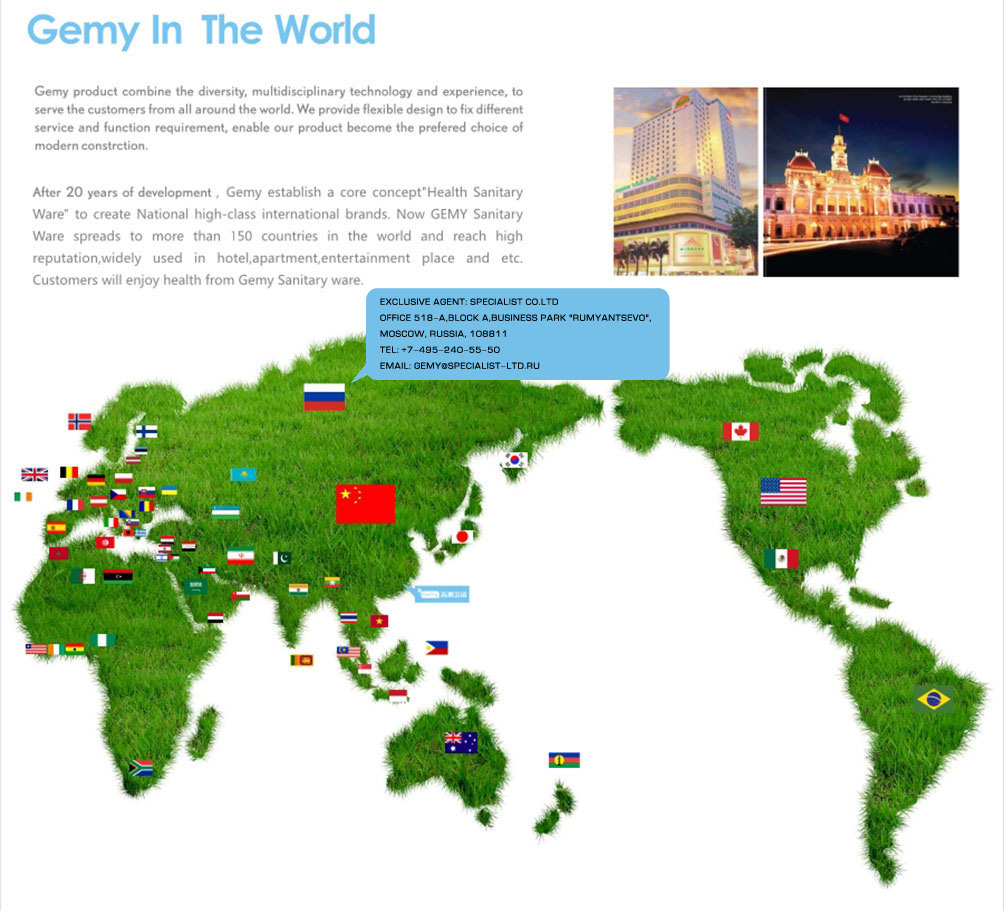 Благодаря оптимальному соотношению цены и качества своих изделий компания Gemy успешно продвигает их наравне с другими лидерами отрасли, особенно в премиальном сегменте, на рынках более чем 50 странах мира. Ванны успешно продаются в странах Европы, Соединенных Штатах Америки, Канаде, Австралии, в странах Азии. С 2009 года Gemy поставляет свою продукцию в России и страны Таможенного Союза с сертификатом ЕАС.